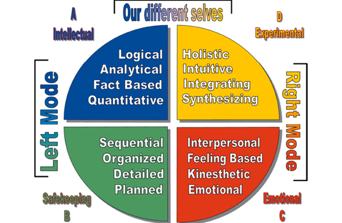 Diverse reasons determine the adoption of Herrmann model. It is innovative, process-oriented, situation-focused, among the 13 most influential models and its instrument is one of the five more recommended instruments to education and training.[40] It is comprehensive,[41] including cognition, affectivity and doing.[42] The model and its instrument, the Herrmann Brain Dominance Instrument has shown to aggregate criterion, face and construct validity.[43] This model considers LS as passive to change, development,[44] and regulation and development through parenting, life experiences, learning environment influences.[45] Moreover, the model aligns with constructivist and student centred learning, and promotes diversification and deep learning.