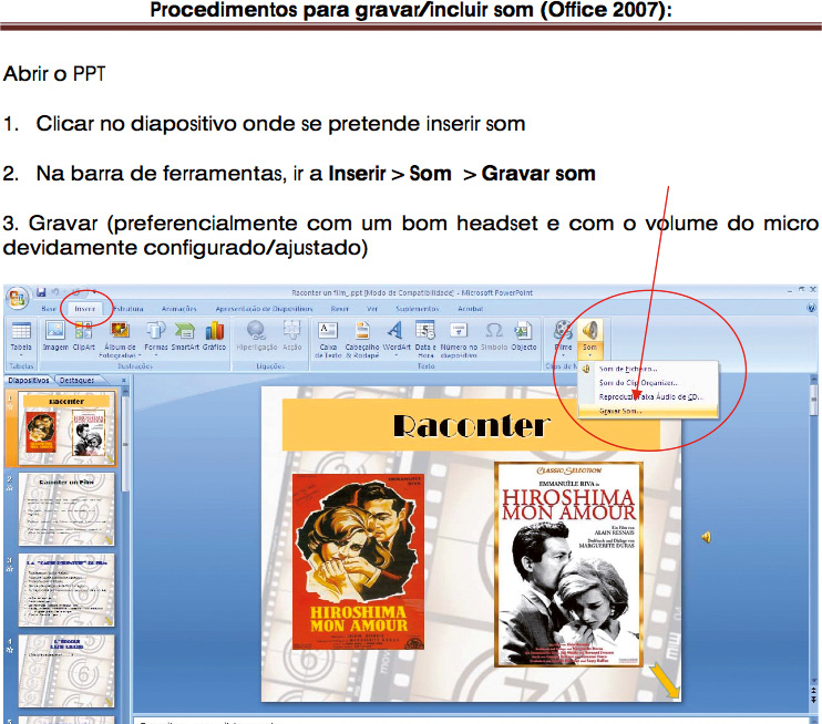 With regard to showcasts, we must start by observing that this term has emerged during our search for solutions to implement oral production, and to minimise the spatio-temporal distance between teachers and students; they are not vodcasts or screencasts. A showcast still differs from enhanced podcasts, which also combine audio and image, because a showcast specifically designates a PowerPoint document for teaching purposes that integrates text, image and audio/video.