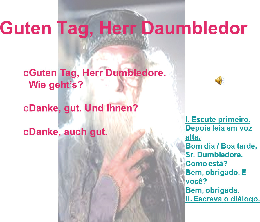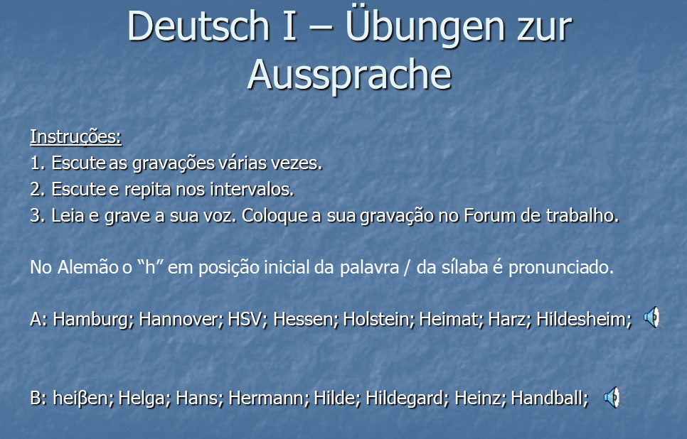 After this initial phase without a book, Optimal A1 was adopted. Given the fact that we were dealing with beginner-level undergraduate students, and that there was no German-Portuguese glossary, it was necessary to address this situation. We decided to prepare a weekly study guide that included a glossary (the glossary tool in Moodle) with all the new vocabulary, with its translation into Portuguese, as well as the spoken version of the vocabulary. To this end, audio files were integrated into the glossary to allow the students to practise the correct pronunciation of words. These audios with the vocabulary and other audios with the structures of the new forms were also made available separately, in order to be listened to by students, using mobile phones, mp4s or tablets.