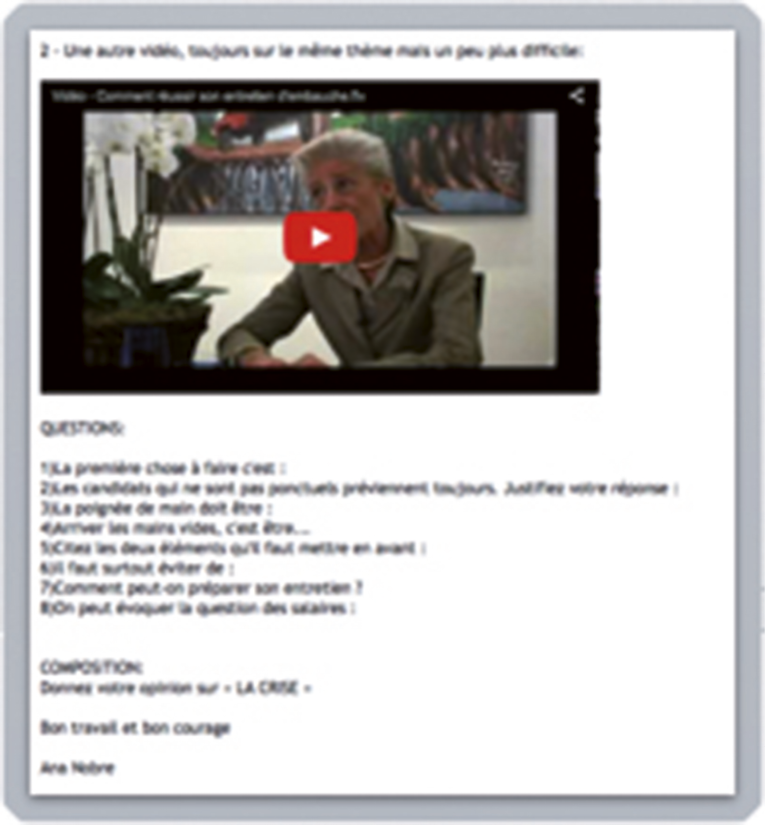 The tasks to be carried out that are directly related to the technologies (for example, producing a video) can be shared as supporting documents or made available as the task is constructed (micro-tasks, intermediate productions...), in order to carry it through. With Europe and Portugal currently in the midst of an economic crisis, the teacher chose to work on the crisis through YouTube videos. The activity “La crisis” consisted of viewing two videos relating to an interview for a job (figure 4).