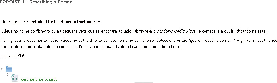 Anticipating the advantages in the use of digital technologies in different contexts and levels of education, particularly in foreign language distance and e-learning education at higher level, and prior to dwelling on their representative excerpts, we would like to mention that we provided tutorials with instructions and examples, in the foreign language curricular units (CUs) on offer at UAb, in order to foster independent learning by the students. Given the heterogeneous profile of our students, these tutorials (figure 1) also ensure that even those who are less familiar with Web 2.0 tools perform the tasks requested in the target language, since this is the object of teaching and learning (and not the acquisition of skills in digital technologies).