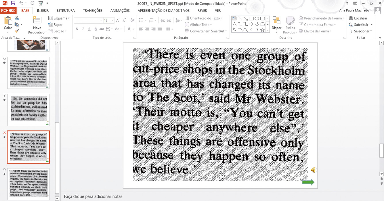 Showcasts have been used to train various competencies simultaneously, e.g. oral comprehension, pronunciation, intonation, prosody, and written production, as the teacher creates a PowerPoint document, records the text, which the student can listen to while he reads it himself/herself, as in the figure 7 and 8. Students are also required to record their own voices, and share their podcasts with the rest of the class. Before they are given this task, they are expected to listen to a dialogue between two of their teachers, in which they introduce themselves.