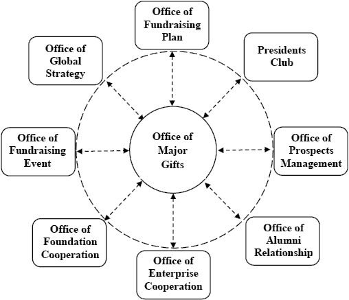 According to the customer orientation theory, it is necessary to establish a highly effective major gifts management structure and cross-departmental organizations in universities to adapt to the continuously changing educational donation market and donor demands. The organization structure of major gifts management in world-class U.S. universities has been continuously expanded and extended in practice, forming a major gifts management structure of “one body with multiple wings” (Figure 1). “One body” refers to the Office of Major Gifts, responsible for the major gifts management, coordination, and services for the entire university. “Multiple wings” refers to other coordinating offices related to major gifts management, working in conjunction to attract major gifts and to provide management services. This type of structure reflects two main characteristics of major gifts management in world-class U.S. universities. The first characteristic is the donation market subdivision and categorized management of donors. University major gifts mainly comprise of university alumni, non-alumni wealthy individuals, corporations, foundations, etc. Therefore, many universities have set up offices such as the Office of Enterprise Cooperation, Office of Foundation Cooperation, Office of Alumni Relationship, Presidents Club, and so on for categorized management and service of donors. These departments provide the Office of Major Gifts with prospective donor data and service support. The other characteristic is the functional subdivision of university donation management. To provide better donation management service, many universities have continuously optimized the donation management process through functional subdivision, and generally set up offices such as the Office of Fund-Raising Plan, Office of Fund-Raising Event, Office of Prospects Management, and so forth. In recent years, U.S. major gifts have started expanding internationally, with certain world-class universities, such as Harvard University, setting up an Office of Global Strategy to be responsible for planning the university’s global development strategy. Meanwhile, universities also set the attraction of international major gifts as a main fund-raising strategy.
