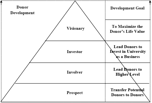 In the long-term university fundraising practice and related research, the United States has formed a relatively rich fundraising theories. Daniel L. Conrad also put forward the theory of Transaction Analysis. According to the theory, public donation is a kind of basic value exchange situations. University fundraising is a basic value transaction between university and donors under the principle of mutual benefit and win-win cooperation. The University fulfills its mission, improves its conditions and achieves its goal by collecting social donations. At the same time, donors realize their philanthropic ideals and meet their personal wishes and psychological needs through donation, including improving their self-image, social status, participating in social interaction, contributing altruism, and realizing their life value. In order to recognize the donor’s philanthropic ideal and value pursuit, the university fundraising organization can take several means to meet the donor’s donation needs and improve the donor’s donation experience, depending on the donor’s donation level and contribution. For example, name the school venue or donation fund project with the name designated by the donor or the donor or invite the donor to participate in various campus cultural activities by publicly thanking, etc.[22] The transaction analysis theory expounds the value exchange between the two parties in the fundraising process, and provides important theoretical guidance for the university to carry out donor demand management, fundraising project design and donor policy evaluation. Apart from this, the literature using the Dictator Game from economic theory neglects to recognize fund raising is a complex and creative activity, and fundraising from the wealthy is fundamentally different from fundraising from the non-wealthy.[23] The fundraising pyramid theory expounds the relationship between donor type, quantity and contribution rate of donors from the pyramid model of donor groups, and provides important theoretical support for the university’s donor hierarchical management and donor relationship training. The fundraising time window theory expounds the important time nodes of the donation potential of donors from the time dimension, and provides theoretical guidance for the university to choose the best time for recruitment. Even though each of those theories could be applied to one aspect of fundraising management, but none could lead the whole process. Only customer orientation marketing theory could make it for it focus on recognizing the demands and meeting them, through which the non-material cost of donors could be reduced and the donation experience could be improved.