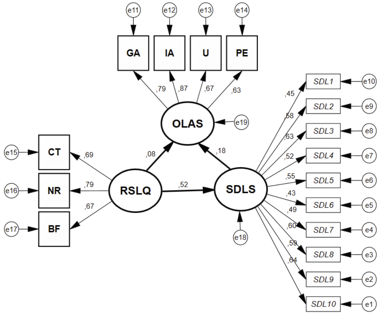 Data were collected via Google Forms containing scales items and related explanations. The participation in the survey was voluntary and it is about 10 minutes to answer all scales items. The public database of YÖK AKADEMİK (https://akademik.yok.gov.tr/AkademikArama/) was used to obtain participants e-mail addresses. Then, I have sent emails including the form link to those addresses. Furthermore, online platforms such as social media groups in which university students participated and WhatsApp groups were used to reach participants. Nevertheless, after analyzing the missing data and outlier, the final dataset included 835 data. The skewness and kurtosis values of the SDLS overall were .13 and -.32 respectively. And they were .35 and .34 for OLAS overall; -.21 and -15 for GA dimension; .41 and .32 for IA dimension; -.27 and -.13 for U dimension and .10 and -.17 for PE dimension. And they were .38 and -.06 for RSLQ overall; .16 and .02 for BF dimension; .10 and -.14 for NR dimension and -.13 and -.51 for CT dimension. The skewness and kurtosis values for each of the three scales and their factors were between +1.96 and -1.96.[99] The findings indicated that the dataset met the normality assumption. 0.05 level of significance was used. Quantitative techniques (descriptive (mean, standard deviation), correlation (Pearson coefficient), Confirmatory Factor Analysis (CFA), Structural Equation Modelling (SEM) (path analysis)) were used to analyze the data. SPSS v. 23 and AMOS v. 23 were used.