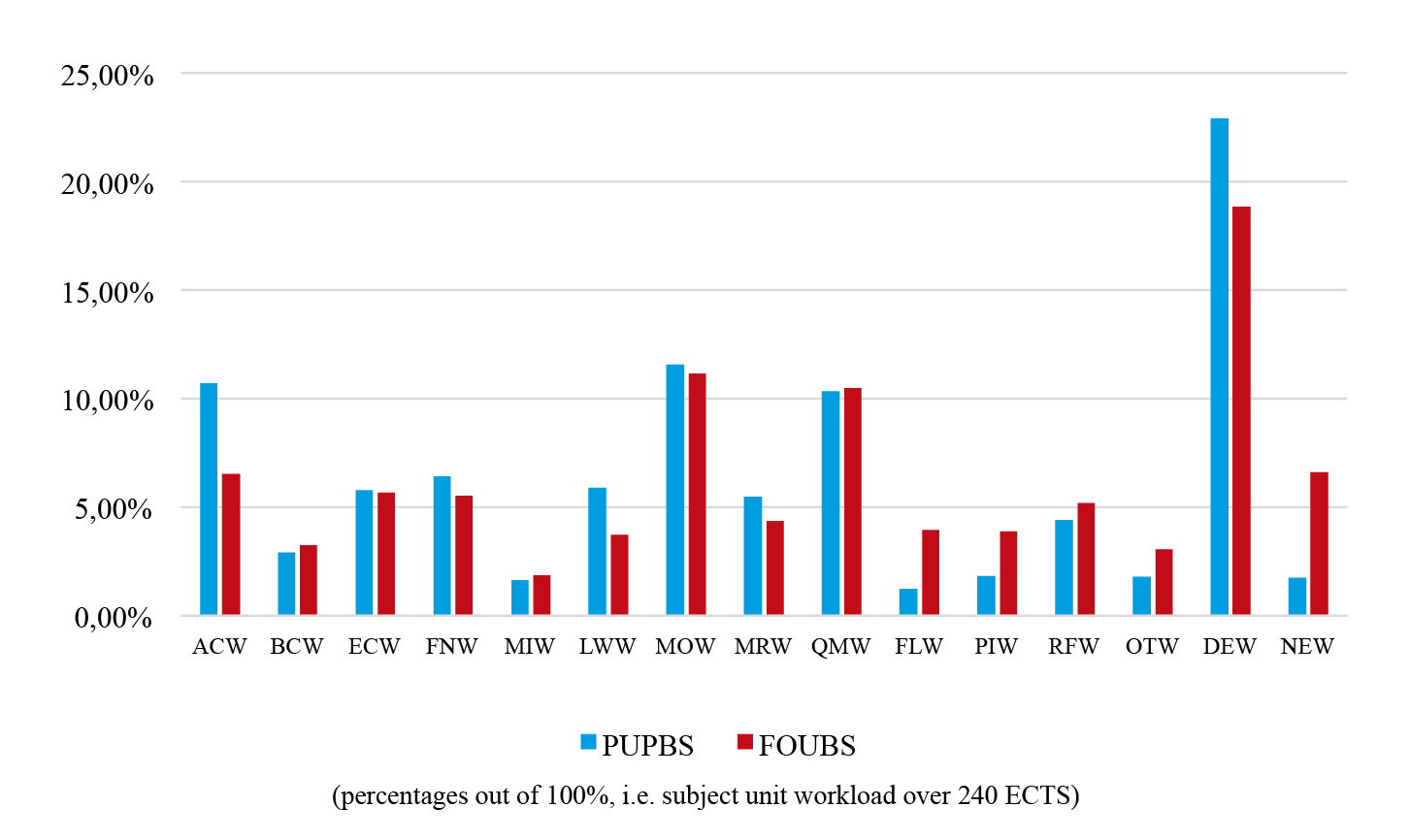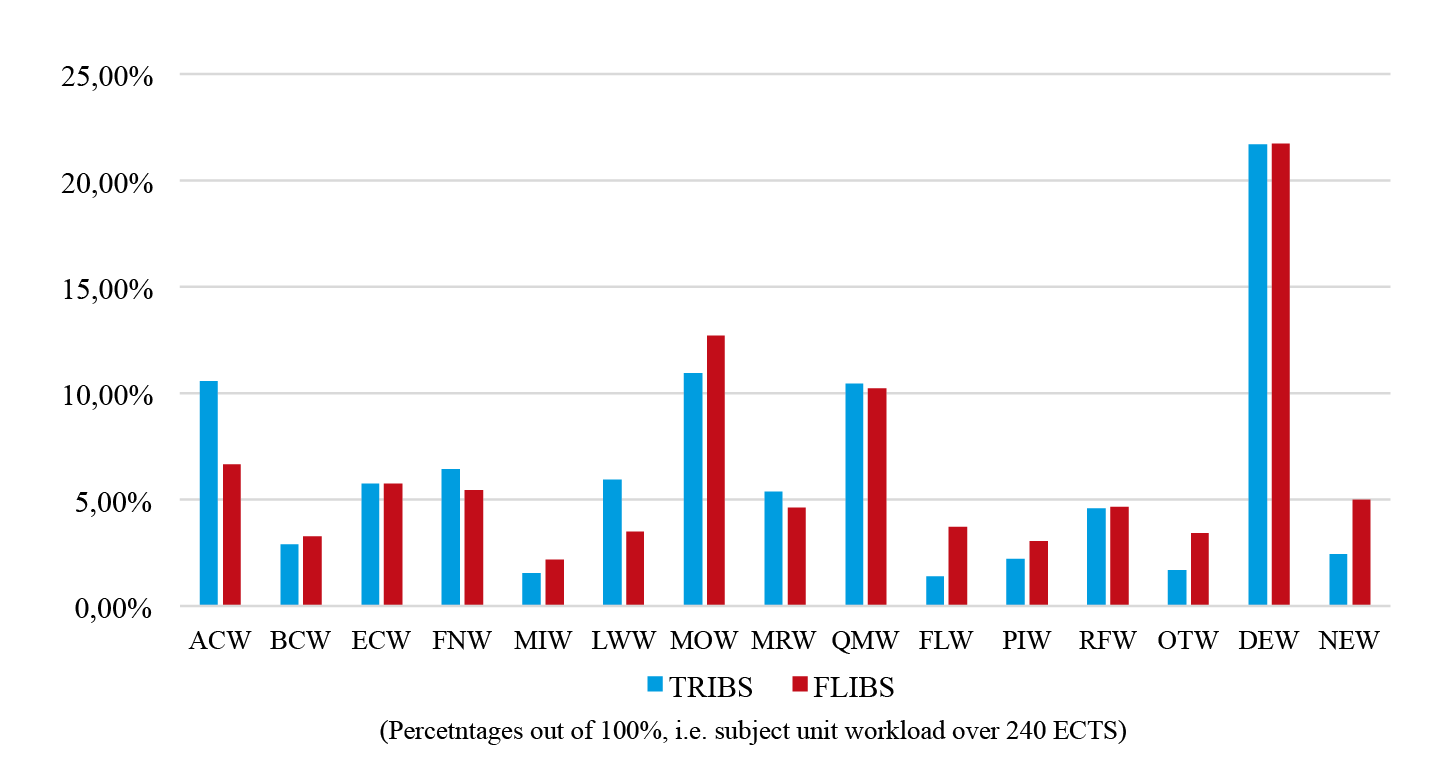 In the next stage of the study, the data of the course groups were gathered together. To create comparable data, the number of course units and a student’s workload for each CRG was selected as dependent variables. The number of credits of the course units allocated according to the European Credit Transfer System (ECTS) was taken into account as the individual student’s workload. In most European countries ECTS has been applied to the curricula of universities as both a credit accumulation and transfer system, with learning outcomes and student workload increasingly used as the basis for credit allocation.[26]