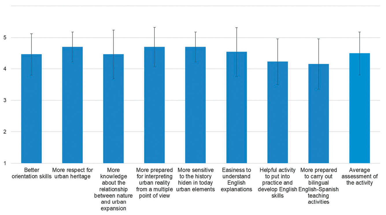 In this research, learning has been defined as the acquisition of geographic competencies, historical thinking, English as a foreign language skills, and didactic projection capacity. Geographical learning refers to the capacity for location and orientation, awareness of historical dependence on natural elements and critical thinking to interpret reality. Historical learning follows a temporal axis that finds its physical foothold in urban heritage, so that the student is able to learn history, see it in their daily lives and develop a civic awareness towards the material and immaterial legacy. When we want to focus on the relationship between geographical and historical competencies, which are practically unavoidable in this activity, we speak of geohistorical competencies. Language learning is framed within the bilingual background of the entire activity, concretized in the combination of interventions in English and Spanish (FL and mother tongue), both in reception and expression tasks. Finally, didactic learning is materialized with the planning of a teaching proposal comprising the knowledge acquired during the workshop.