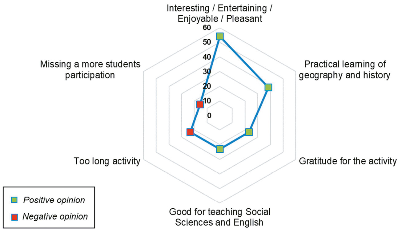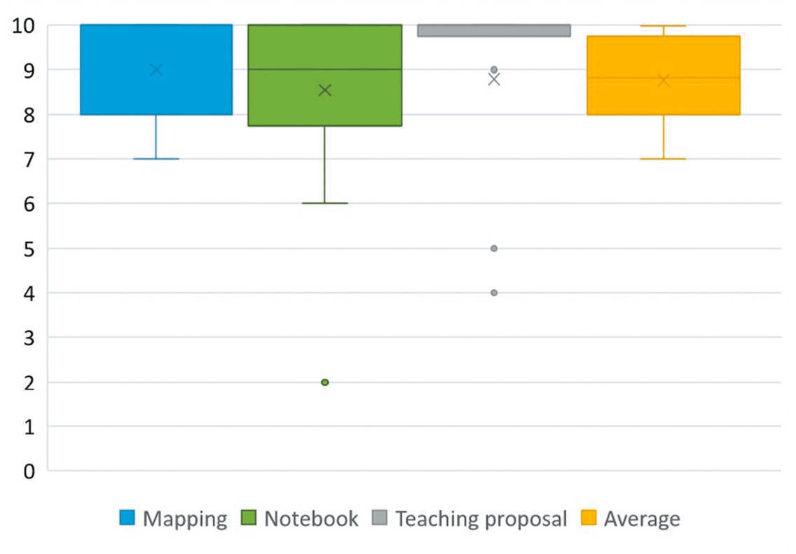 In order to quantify the acquisition of these competencies (SO2), three assessment procedures were carried out (Table 2). The first consisted of the comparative analysis of a pre-test and a post-test, by filling in a questionnaire by the students in two phases (before starting the activity and once it was finished) with questions structured in three thematic blocks: Geography (five multiple-choice questions), History (nine multiple-choice questions), and English (seven short-answer questions). In the second phase questionnaire, a student assessment block was added, with eight items to be scored with a Likert scale from 1 to 5 from lowest to highest level of agreement on logistical, motivational and didactic awareness issues, in addition to a question inviting free comment. The second assessment procedure consisted of the elaboration of a learning matrix with the difference between the values of the thematic blocks of the second phase of the questionnaire and the first. The third assessment was the completion of the Dossier of activities, made up of three groups of tasks: marking the itinerary on a map, carrying out practical exercises at the stops on the itinerary and designing the teaching proposal.