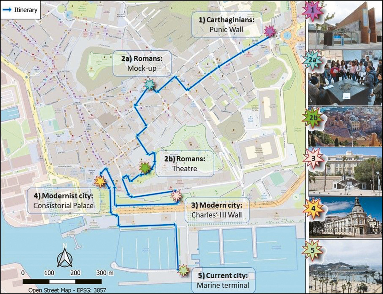 The itinerary took place in the Spanish city of Cartagena (Spanish as the native language), where the study centre of the participants is located and which constitutes its urban reference area. There is consensus on the idea that carrying out a teaching activity in a well-known place contributes to achieving more meaningful and motivating learning.[44] In addition, the city has wide-ranging urban characteristics[45] that allow the design of an itinerary focused on geohistorical aspects.