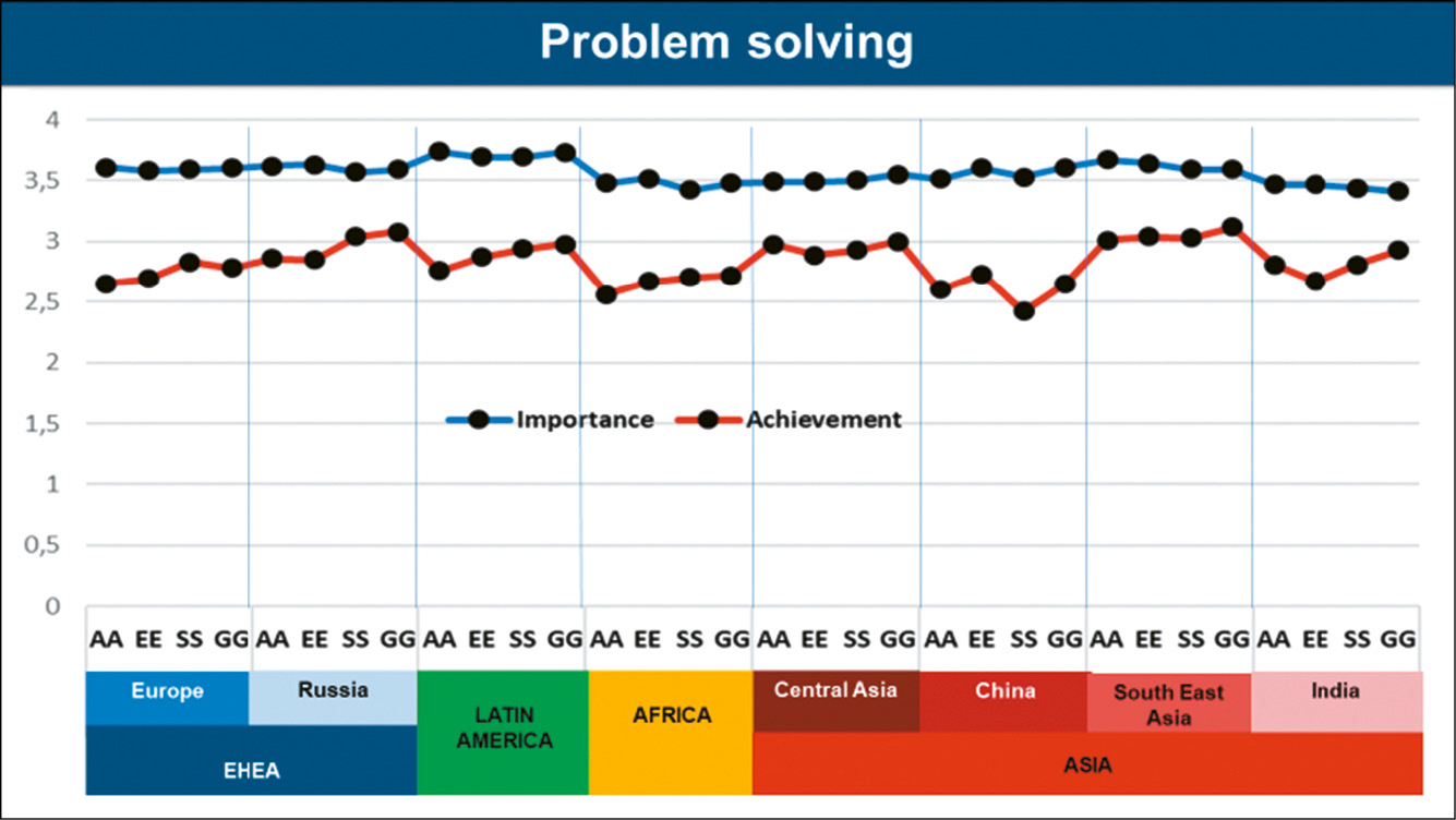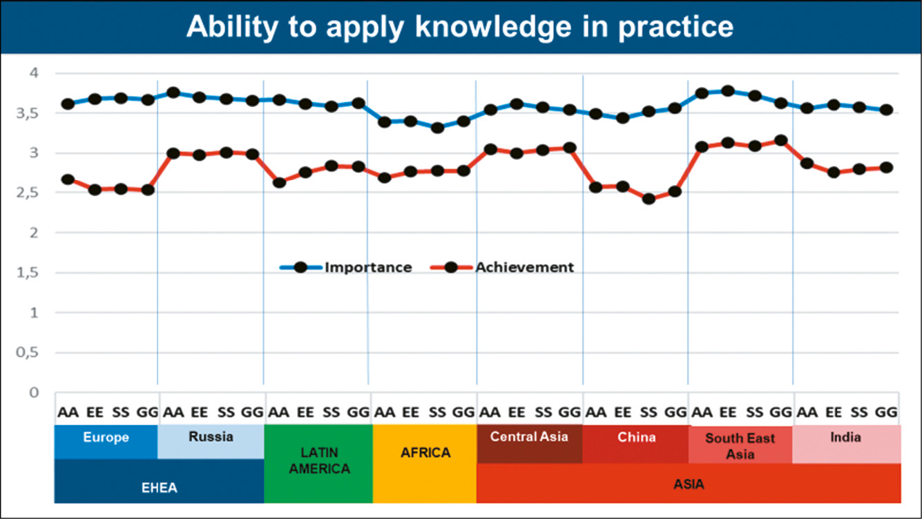 As for the gap between importance and achievement, there is a clear pattern for almost all studies: Academics report the biggest gap (except for Central Asia and India), with the biggest one reported in Africa. Students in four studies report the smallest gap (Russia, Latin America, Africa and India), with the gap reported in Russia being the smallest.