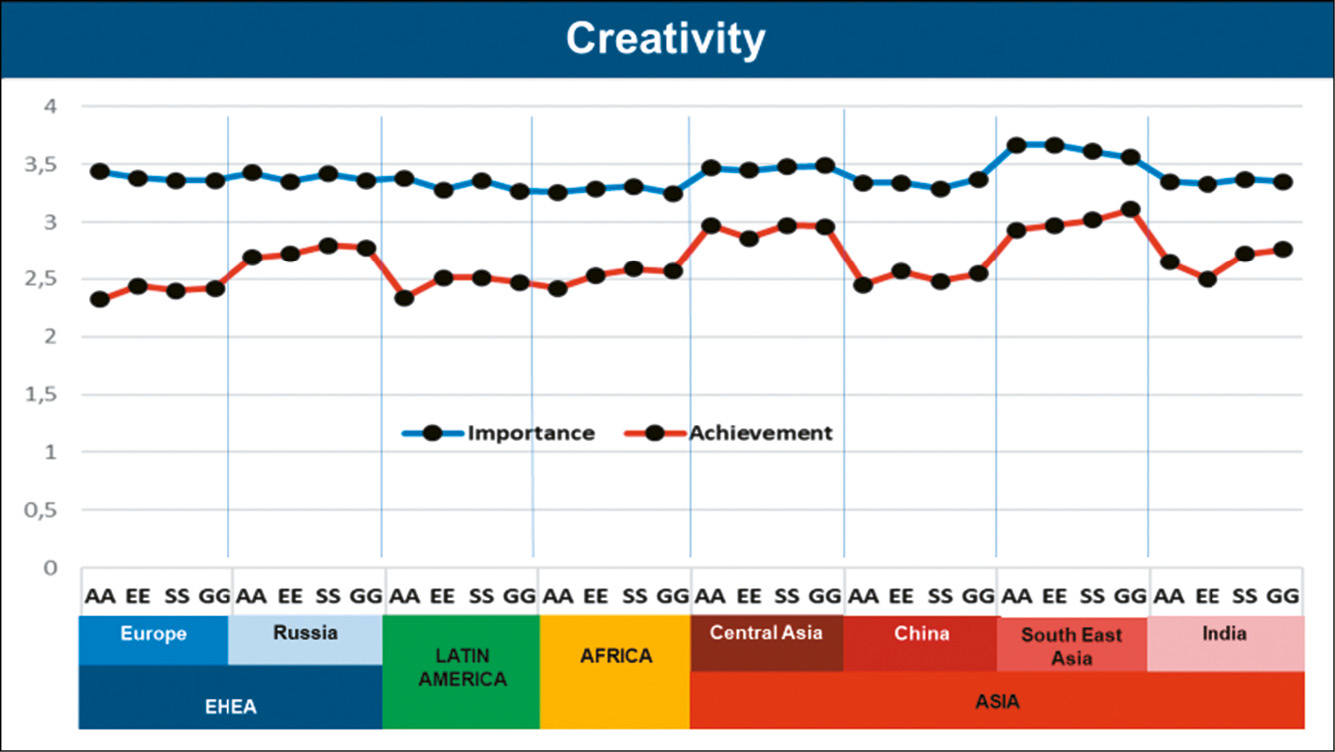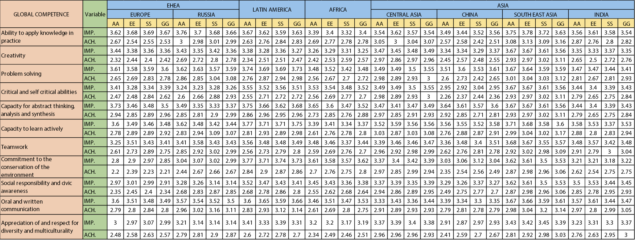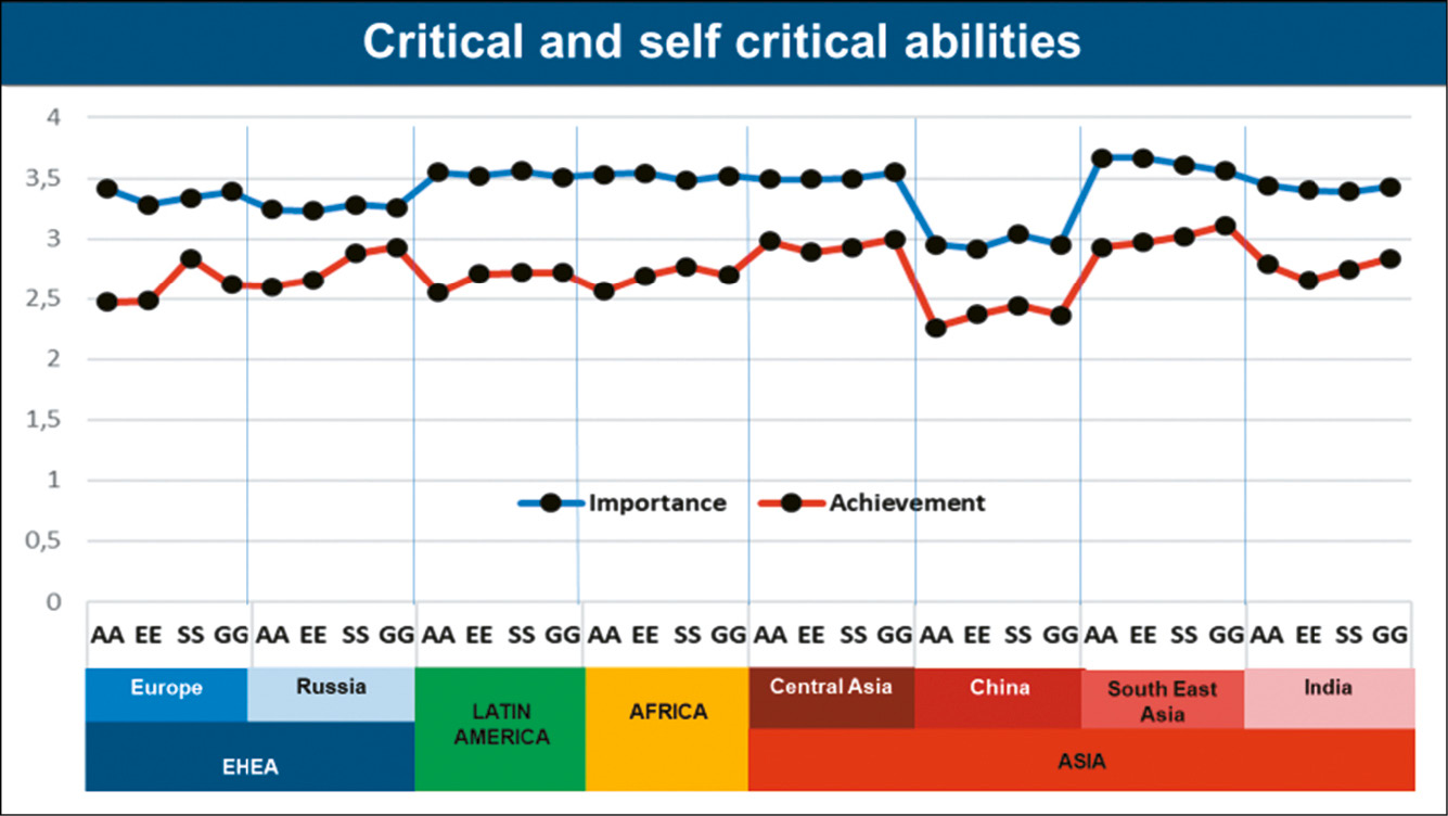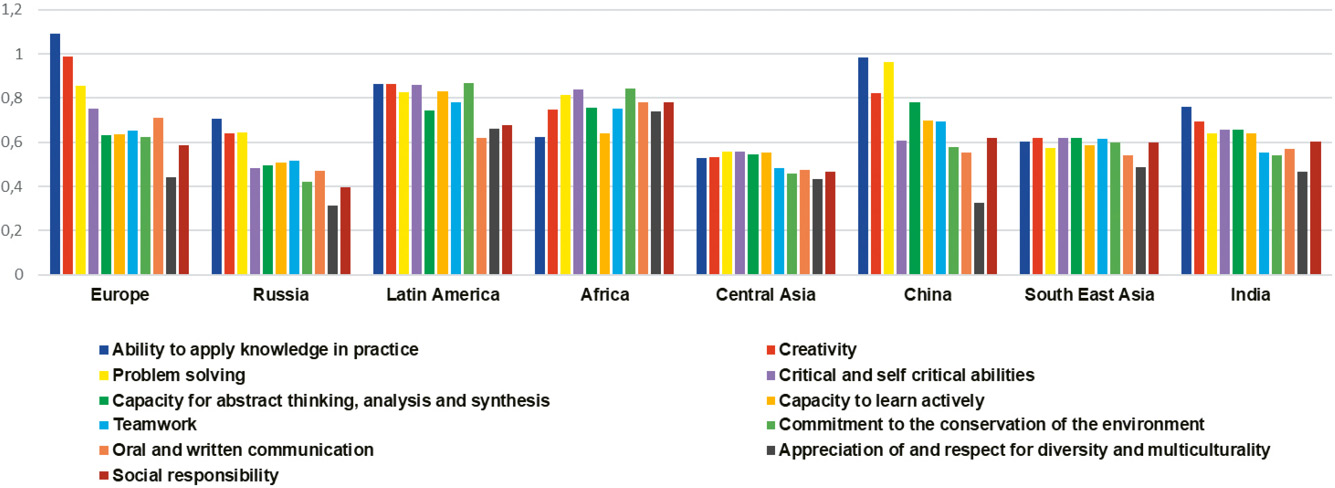 It has been observed that there are differences that are visualized in the comparative analysis of each of the 11 global competences in the regions and countries. Here both the level of importance and the gap between the importance and the level of achievement provide very interesting elements for reflection. Variations are observed in terms of regions, but also in terms of the perception of the different stakeholder groups. For example, in the data related to importance, there are competences that show a similar behavior from the point of view of the four stakeholder groups within the same region (e.g. ‘Appreciation of and respect for diversity and multiculturality’ in Africa, China and South East Asia), and competences where certain stakeholders have a convergent perception, regardless of the region from which they respond (e.g. Students in all the studies valuing ‘Teamwork’ competence less than Graduates).