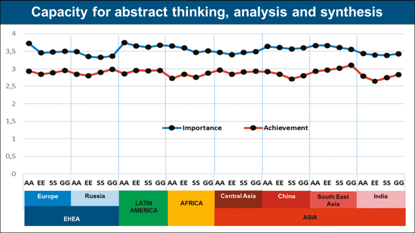 In relation to the perception of importance from the perspective of the stakeholders, there seems to be clear patterns across regions. Academics most often value ‘Capacity for abstract thinking, analysis and synthesis’ the most (in seven studies) and Students the least (in five studies). The region that values this competence the least is EHEA, with Russia as the zone giving it the lowest average rating. On the other hand, Latin America rated ‘Capacity for abstract thinking, analysis and synthesis’ the highest, with Academics in Latin America being ‘the champions’ of this competence (3.75).