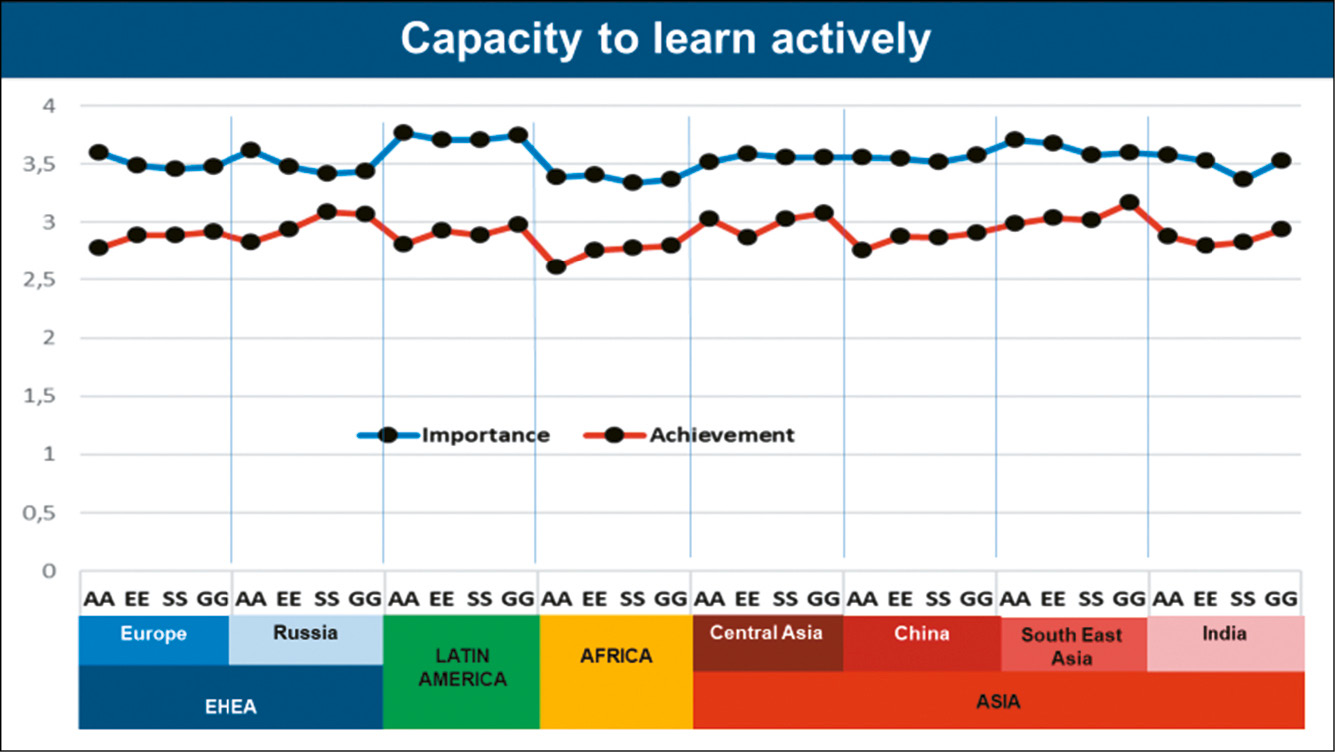 If we compare the perception of the different stakeholder across the regions, Academics most often value ‘Capacity to learn actively’ most (in five studies) and Students tend to value it least (in seven studies). Except for Central Asia, Graduates everywhere value this competence higher than Students. Latin America values ‘Capacity to learn actively’ the most (with Academics being the ‘champions’ – 3.77).