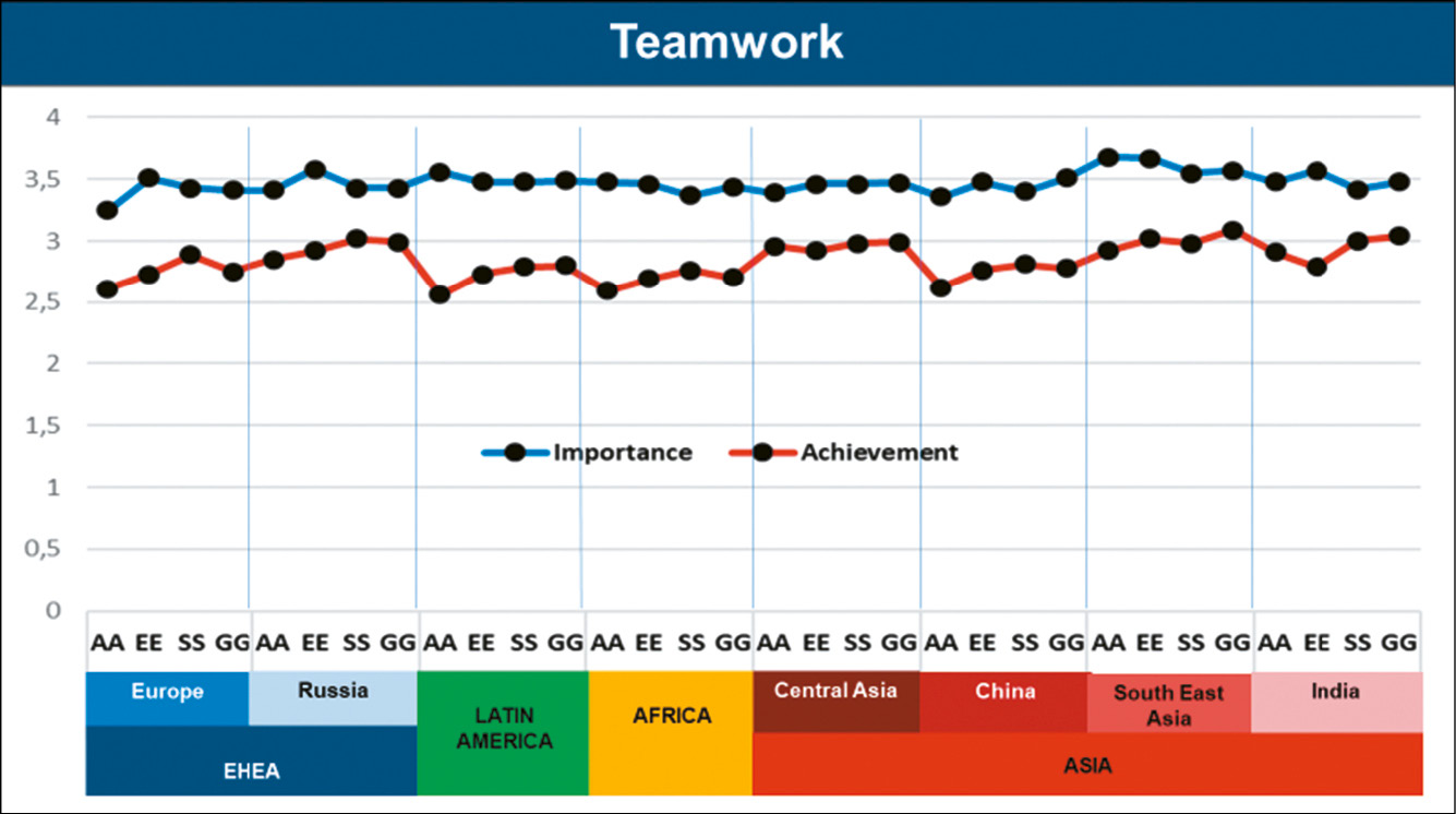 In terms of the gap, Students most often report the smallest gap, while Employers and Academics tend to report the highest (Academic in four studies and Employers in the other four). Except for China, Employers everywhere appear more concerned with the level of ‘Teamwork’ development than Graduates. Latin America reports the biggest gap, Asia and EHEA, the lowest. Finally, Students in Russia see the smallest gap in achievement, while Academics in Latin America rate it the highest.