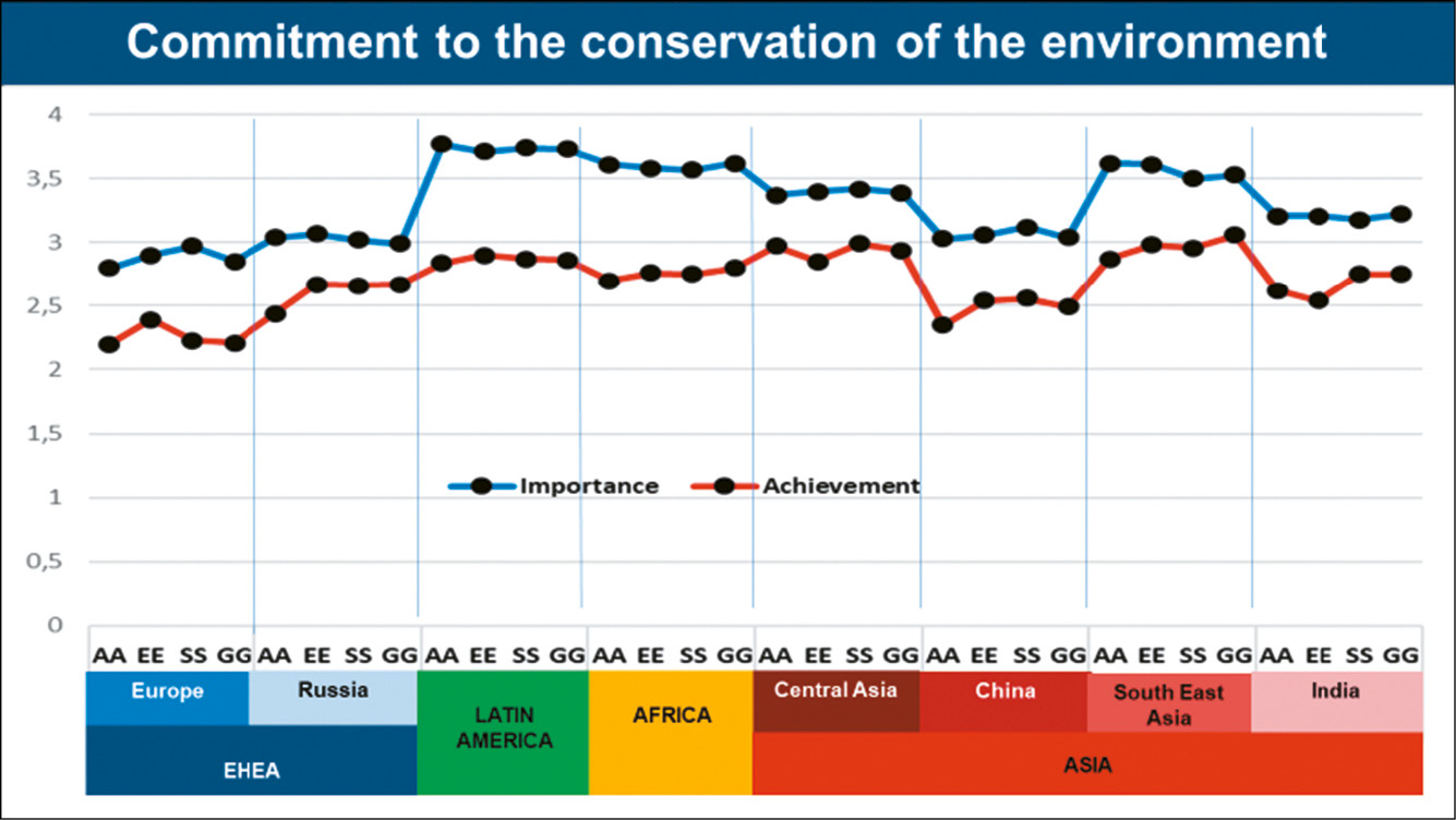 Latin America and Africa reported the widest gap between importance and achievement for ‘Commitment to the conservation of the environment’. It is interesting to note that, as mentioned above, this competence is at the top of the importance list for all stakeholders in both regions.