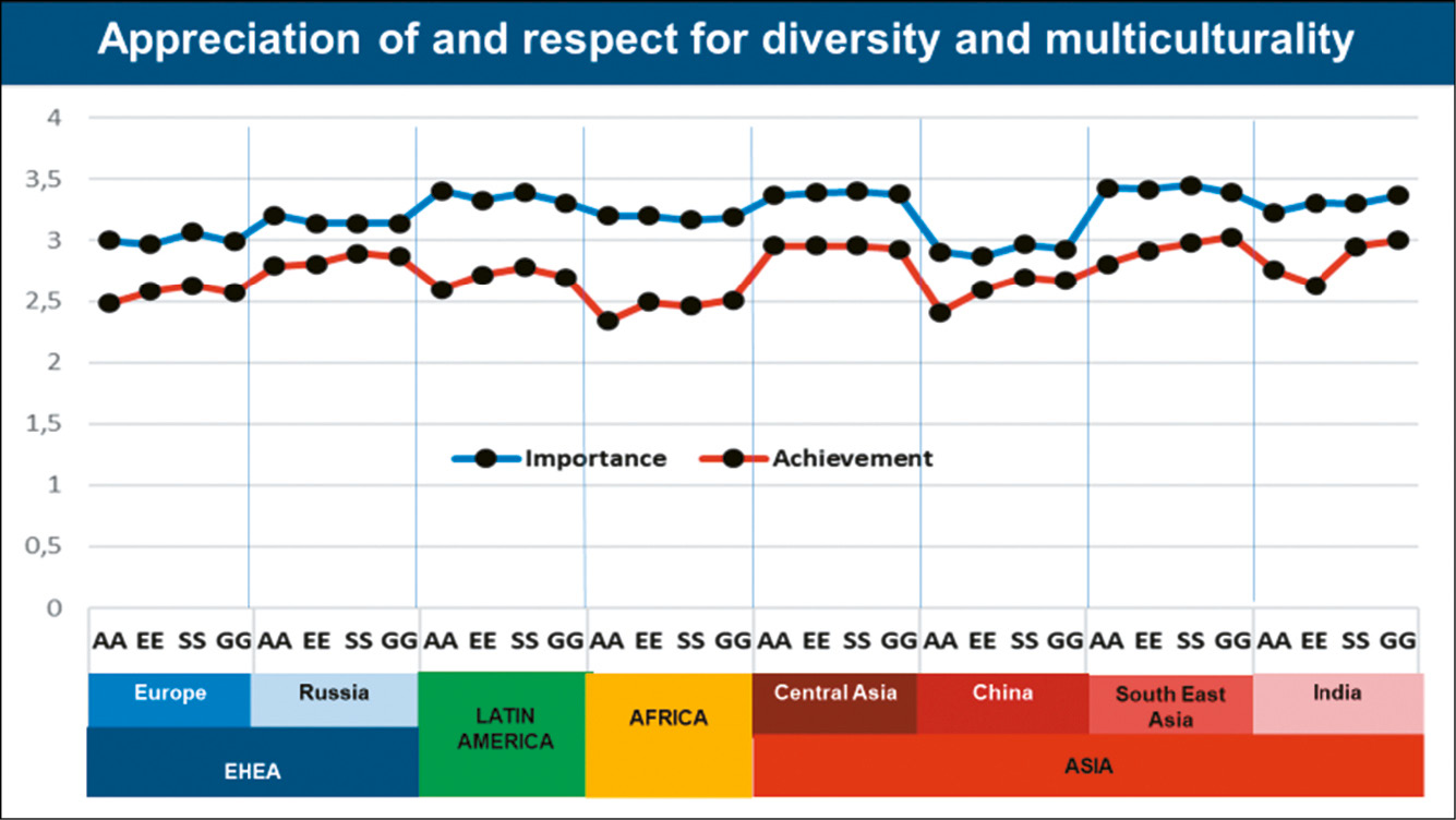 As for the gap between perceived importance and achievement, Academics reported the biggest gap in six studies (except for Central Asia and India), while Students reported the smallest gaps in four of the studies, and the second-smallest in three more. EHEA is the region where the gap observed across the stakeholder groups is the lowest (0.37; and even lower for Russia as a single study - 0.31). Africa is the region with the highest average gap reported for ‘Appreciation of and respect for diversity and multiculturality’ (0.74). Finally, Academics in Africa reported the highest gap (0.86), while Students in Russia were the group who perceived the smallest gap (0.24).
