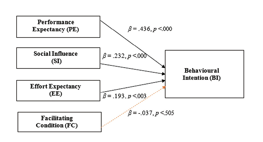 Based on the analysis, PE (β = .436, p <.000) was the most crucial factor in predicting postgraduate students’ intention to use LMS, followed by SI (β = .232, p <.000) and EE (β = .193, p <.003) (Table 3). The value of the standardized beta coefficient (β) determines the strength of the relationships between both variables. Meanwhile, the result also showed that FC had no impact on postgraduate students’ intention to use LMS (β = -.037, p <.505). Figure 2 reflects graphical representation of the standard regression analysis. The model was also found to be highly significant at F(1, 4) = 2490.753, p < 000 as reflected in Table 4.