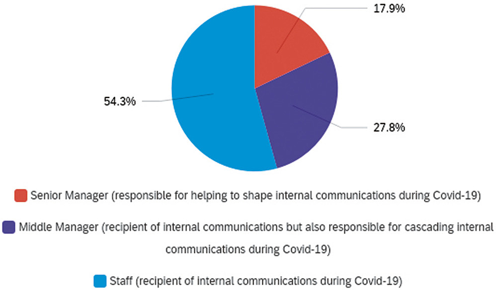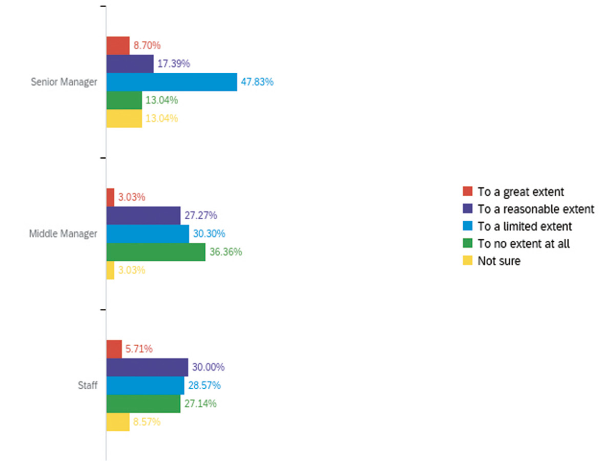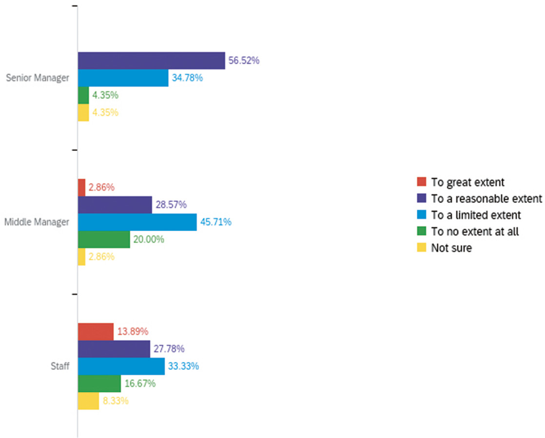 These views are reinforced by Figure 5 which shows the limited number of staff who felt internal communications tackled reward and recognition to a great extent. Especially interesting are the Z-test results for the number of middle managers (20%) who felt that internal communications addressed reward and recognition to no extent at all. The fact that middle managers are significantly more likely than their colleagues to view reward and recognition as being absent from communications might say something about how this group feel they have been treated. A possible explanation for this is that middle managers were furloughed later than their line reports, particularly as part-time furlough became available, and feel that their efforts to ‘hold down’ departments with limited staff resource have not been fully, or at least explicitly, appreciated by senior staff.