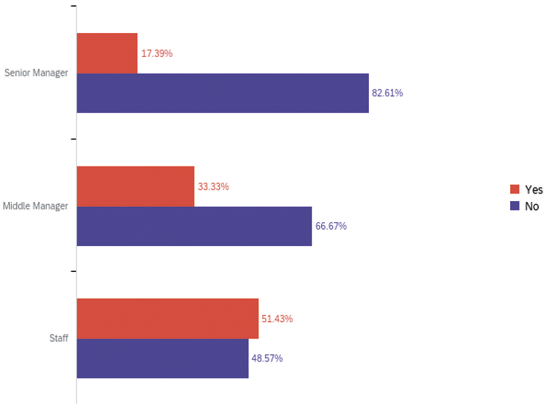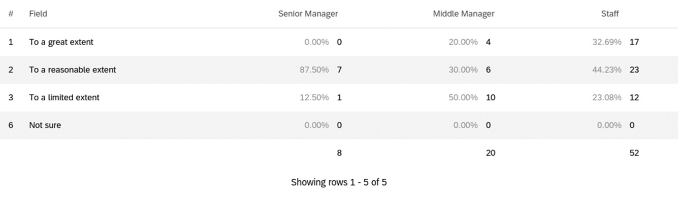 Figure 4 provides a breakdown of furloughed staff by role designation, showing a predictable distribution based on organisational hierarchies. Table 5 provides an overview of staff who reported that they were worried about their job security during the pandemic. It clearly demonstrates there is a divide between managerial staff and their more junior counterparts.