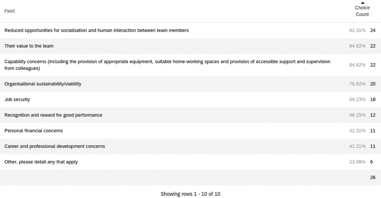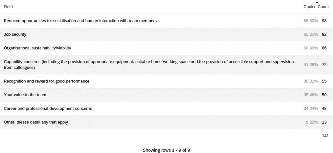 Table 1 illustrates a linear escalation through Maslow’s hierarchy, with staff most concerned about those issues at the base of the hierarchy. The de-stabilising effect of the pandemic on organisations means the ensuing alarm about personal job security, which maps to the physiological and safety tiers, is the second most pronounced concern among respondents (65.25%). Concerns about reduced opportunities for socialization (69.50%), which map to Maslow’s concept of belongingness, were more acute than those of job security. Interestingly however, preliminary results from this study, analysed at an earlier stage in the pandemic found job security was the most significant concern among staff. This serves to reinforce progress through Maslow’s hierarchy, in that as initial fears of job security reduce slightly, the longer the crisis extends, the more staff become concerned about issues of belongingness.
