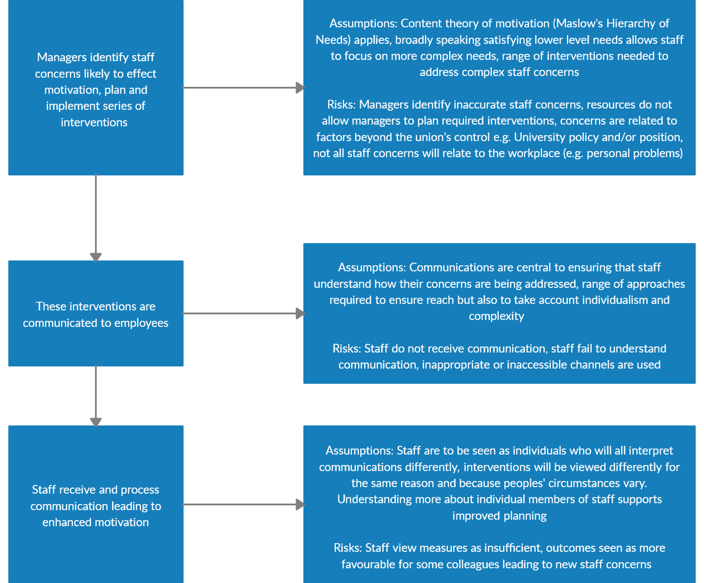 My theory of change (see Figure. 2) is predicated on the basis that managers identify concerns that are likely to effect staff motivation, that they then identify existing and/or new interventions to address these concerns and communicate them to their employees, who process that information and, where this is done effectively, it has a positive impact on motivation. The theory was also constructed based on a hypothesis, having viewed emerging communications from several students’ unions, that Maslow’s hierarchy of needs was implicitly forming the basis of unions’ communications strategies.[11] Consequently, the survey device was built to align sections against Maslow’s tiers, which also allowed his theory to be used as an analytical tool when interrogating the data.