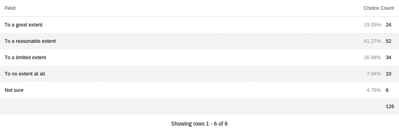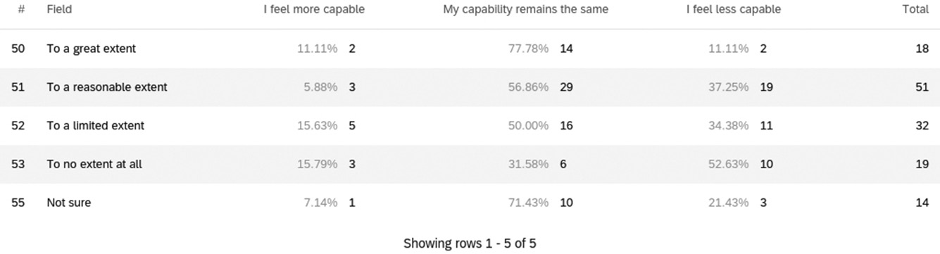 Table 6 shows a troubling picture of the number of staff who feel less capable in their work than before the pandemic, particularly among those who previously considered themselves the most capable. As can be seen by Table 7, well over a quarter of staff (29.10%) also felt their union could have done more to address capability. When asked to provide more details, staff said: “ensured that everyone had the basic capability to do their job through technology and working environment at home”; “communication to check on concerns with technology”; “it took a while for equipment requests to be processed”; “providing access to technology requested a bit sooner”; “provision of equipment earlier than 6 months into the ‘working from home’ approach”; “phone call to discuss our setup, what equipment we require”.