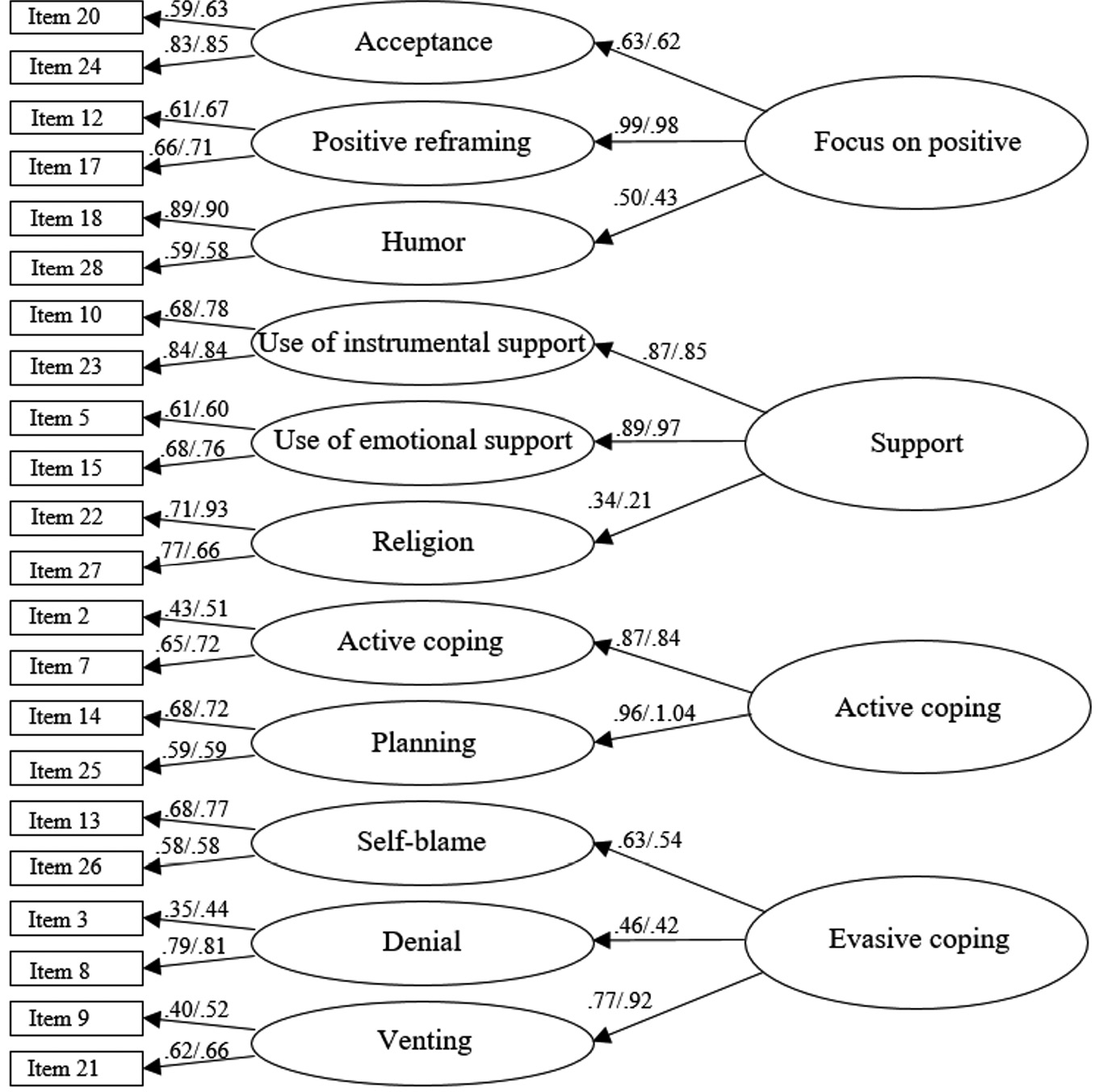 The factors are active coping (e.g., “I’ve been taking action to try to make the situation better”), planning (e.g., “I’ve been thinking hard about what steps to take”), positive reframing (e.g., “I’ve been looking for something good in what is happening”), acceptance (e.g., “I’ve been learning to live with it”), humor (e.g., “I’ve been making jokes about it”), religion (e.g., “I’ve been praying or meditating”), using emotional support (e.g., “I’ve been getting emotional support from others”), using instrumental support (e.g., “I’ve been getting help and advice from other people”), self-distraction (e.g., “I’ve been turning to work or other activities to take my mind off things”), denial (e.g., “I’ve been refusing to believe that it has happened”), venting (e.g., “I’ve been expressing my negative feelings”), substance use (e.g., “I’ve been using alcohol or other drugs to help me get through it”), behavioral disengagement (e.g., “I’ve been giving up the attempt to cope”), and self-blame (e.g., “I’ve been criticizing myself”).