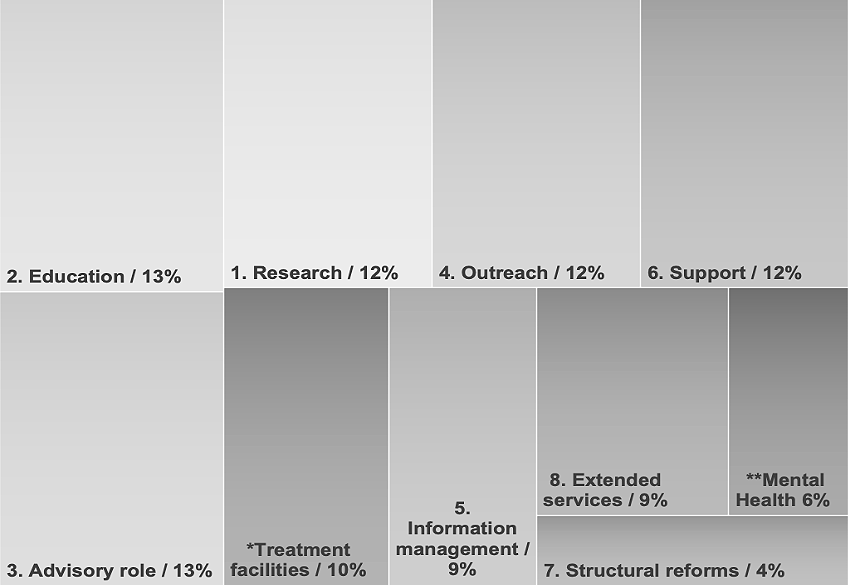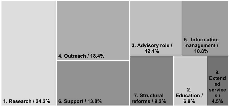 The responses by these universities, interpreted as quantified efforts, provided an approach to understand how those efforts were decided, indicating the institutional priorities behind them. A clear trend in their responses to COVID-19 was the value attached to Research, which obtained the highest score as Area of Engagement (24%), followed by Outreach (18%) highlighting the level of priority given to cooperation with external stakeholders. The third noteworthy Area of Engagement was Support (14%), indicating the high level and wide engagement these universities had toward their internal and external communities and partners.