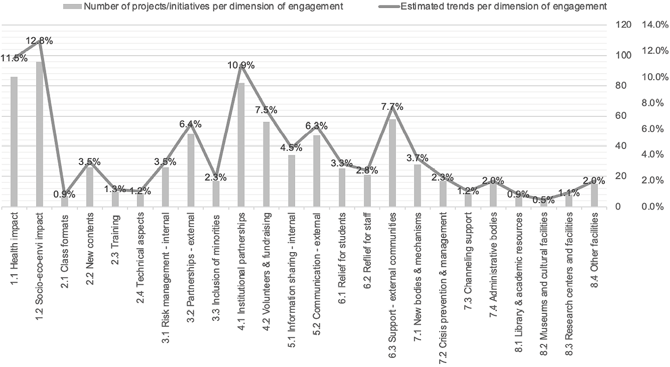 Then the narratives were divided into blocks of text, and later into items that were quantified to obtain observable trends. Given the novel nature of the kind of data, an original method of analysis was created to interpret and quantify the original data provided by the universities. To quantify the data, narrations from the universities were first consolidated as independent case studies. Then, narratives were divided into blocks of text depending on the nature of the policy or initiative described. Pieces of text with similar information were grouped into what was defined as Areas of Engagement (namely, Research, Education, Advisory Role, Civic Engagement, Information Management, Provision of Support, Structural Reforms, and Extended Services). Each Area was then divided into dimensions and sub dimensions providing more details.