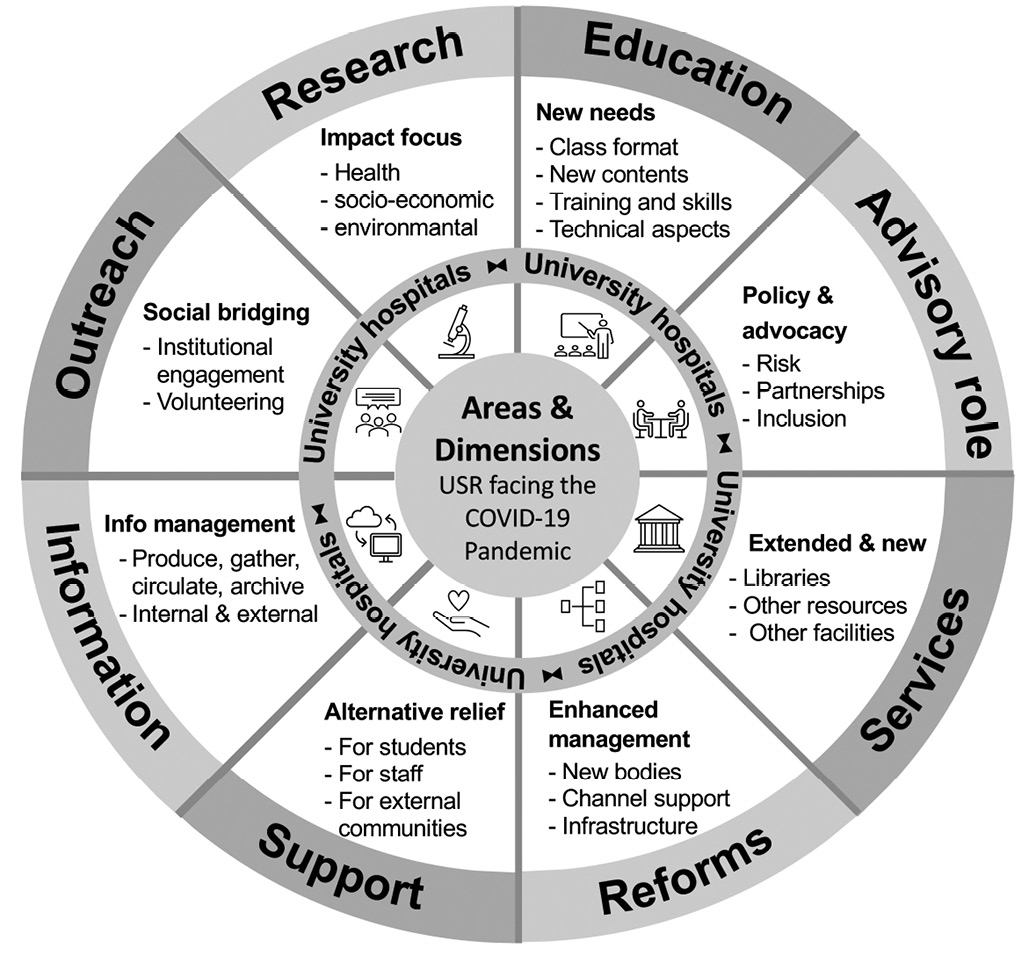 Based on the experience of the MOOC, the article presents a fresh contribution in several ways: a) showcasing initiatives through which universities responded to the pandemic, b) offering an approach to map initiatives organized in Areas of Engagement, c) proposing an integrated scheme to better understand the meaning and diversity of USR, and d) addressing general questions about how COVID-19 changed the understanding of social responsibility of universities and the policy as well as theoretical implications spurring from it.