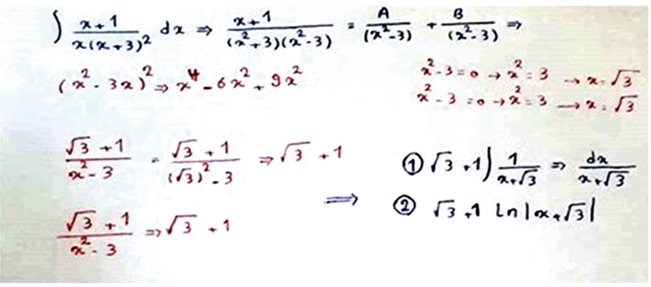 Strategic error: In this type of error, the person makes a strategic mistake; in other words, he/she makes a mistake in using the appropriate strategy. Table 1 shows that a significant number of students, i.e., 82.23%, made a strategic error in calculating the integral. Figure 4 shows an example of this error.