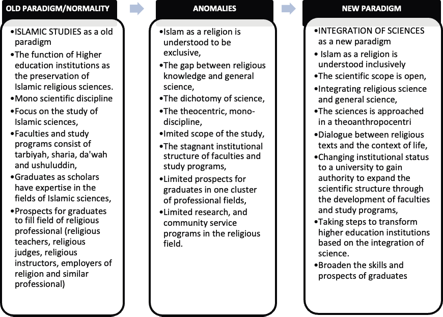 Based on these conceptions, the transformation has a relationship with the paradigm. The paradigm shift is a natural and open process resulting from critical reflection on the reality based on experience to seek better values to produce changes and future progress. In this process, the transformation is carried out based on understanding and belief and then followed by more systematic action steps so that the worldview can obtain the future. This concept is in line with Thomas S. Kuhn’s theory of the paradigm shift process. Paradigm as a normal view of science when experiencing anomalies and crises will encourage revolutionary steps to produce a new paradigm that is believed to be more appropriate. This process has changed.