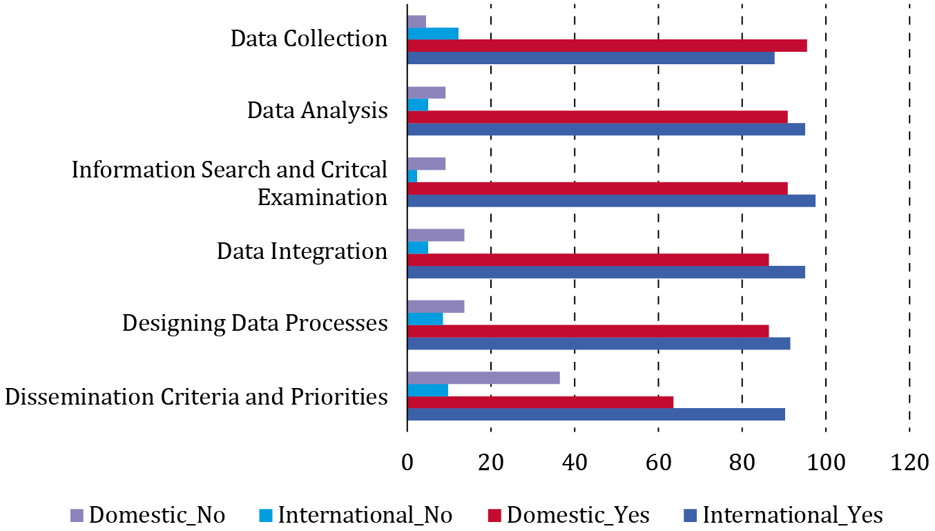 Regarding core research capabilities, the distribution between graduates in domestic and international universities, did not show major differences. However, it was interesting to note that there was a slight difference in skills acquisition between the two groups regarding dissemination criteria and priorities skills. 90.2 % of the international PhD holders stated that they had acquired this competence, compared to 63.6 % of the domestic PhD holders (see Figure 1).